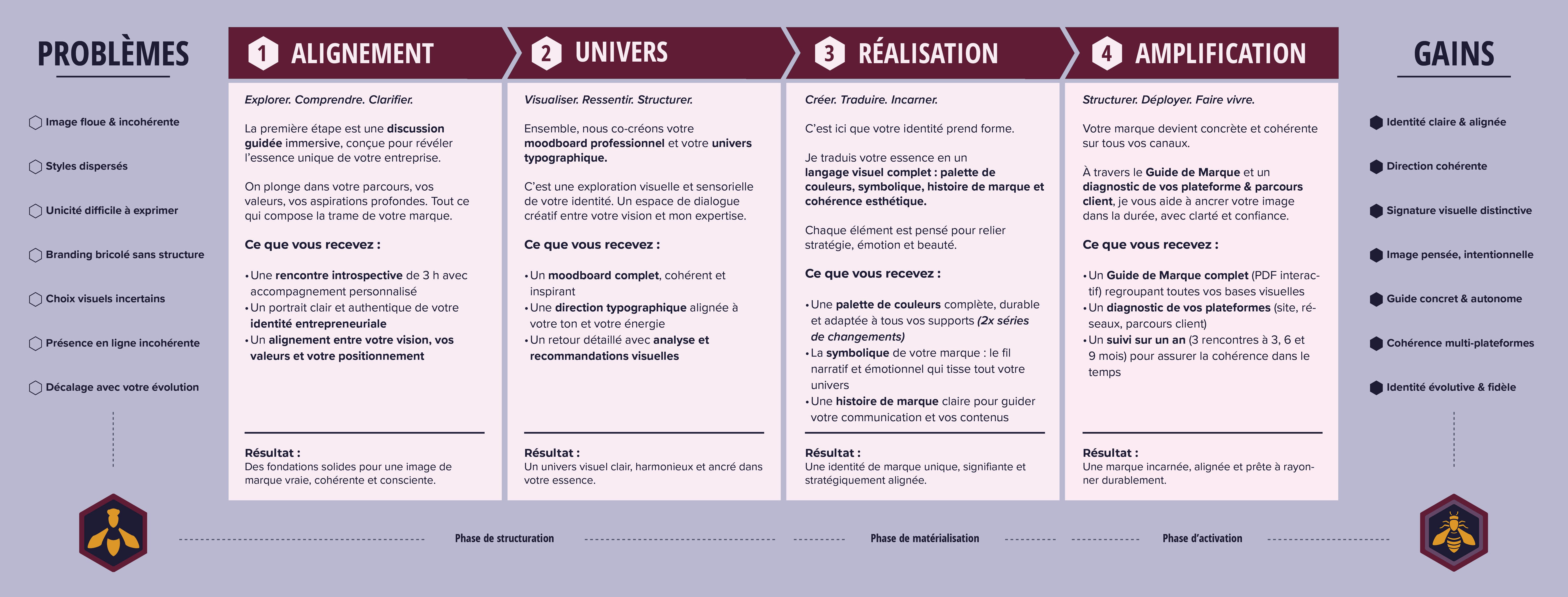 Fondation de marque est un programme structuré et autonome qui vous guide étape par étape. Si vous souhaitez un niveau de personnalisation plus profond avec des feedbacks directs et une co-création sur mesure, vous pouvez envisager l’option Co-création de marque.